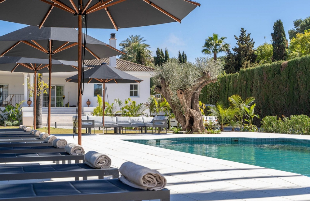 La longue piscine est entourée de bains de soleil, d'un salon extérieur, de tables basses dans une atmosphère très privée. Pour parfaire l'émerveillement, un jacuzzi est à votre disposition pour des moments de relaxation, sous le feuillage léger des palmiers et des pins.